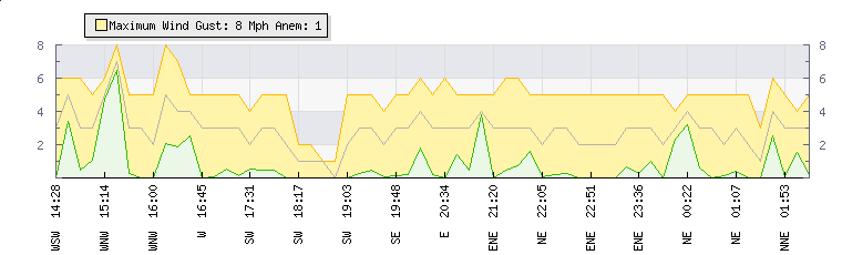 In the last few minutes the wind was North Easterly at an average speed of 3 mph, reaching up to 4 mph and a low of 2 mph. The gust strength is2 mph above the minimum speed |