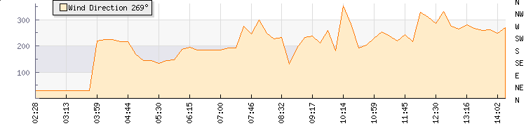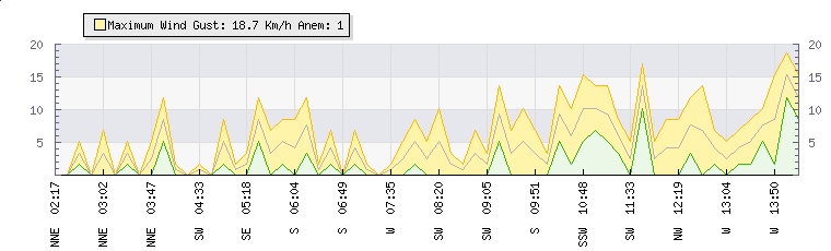 In the last few minutes the wind was South South West at an average speed of 3 kmh, reaching up to 5 kmh and a low of 0 kmh. The gust strength is5 kmh above the minimum speed |