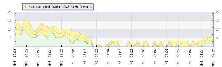 In the last few minutes the wind was North Easterly at an average speed of 2 kmh, reaching up to 3 kmh and a low of 0 kmh. The gust strength is3 kmh above the minimum speed |