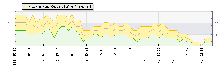 In the last few minutes the wind was North Westerly at an average speed of 4 kmh, reaching up to 5 kmh and a low of 3 kmh. The gust strength is2 kmh above the minimum speed |