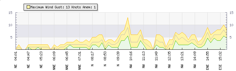 In the last few minutes the wind was North Easterly at an average speed of 1 knots, reaching up to 2 knots and a low of 0 knots. The gust strength is2 knots above the minimum speed |