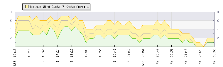 In the last few minutes the wind was North Westerly at an average speed of 3 knots, reaching up to 3 knots and a low of 2 knots. The gust strength is1 knots above the minimum speed |