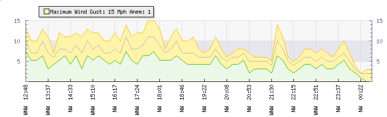 In the last few minutes the wind was West North West at an average speed of 5 mph, reaching up to 7 mph and a low of 3 mph. The gust strength is4 mph above the minimum speed |