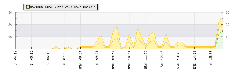 In the last few minutes the wind was Southerly at an average speed of 0 kmh, reaching up to 0 kmh and a low of 0 kmh. The gust strength is0 kmh above the minimum speed |