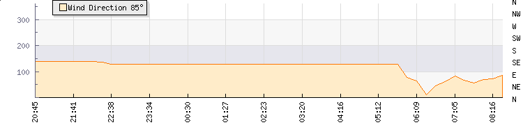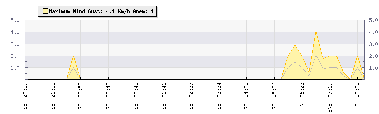 In the last few minutes the wind was East North East at an average speed of 1 kmh, reaching up to 1 kmh and a low of 0 kmh. The gust strength is1 kmh above the minimum speed |