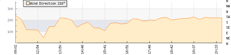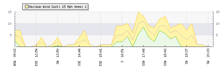 In the last few minutes the wind was South Westerly at an average speed of 7 mph, reaching up to 9 mph and a low of 4 mph. The gust strength is5 mph above the minimum speed |