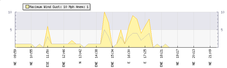 In the last few minutes the wind was North Easterly at an average speed of 0 mph, reaching up to 0 mph and a low of 0 mph. The gust strength is0 mph above the minimum speed |