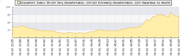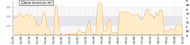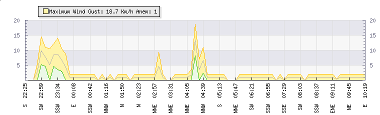 In the last few minutes the wind was South South West at an average speed of 5 kmh, reaching up to 11 kmh and a low of 0 kmh. The gust strength is11 kmh above the minimum speed |