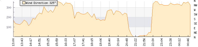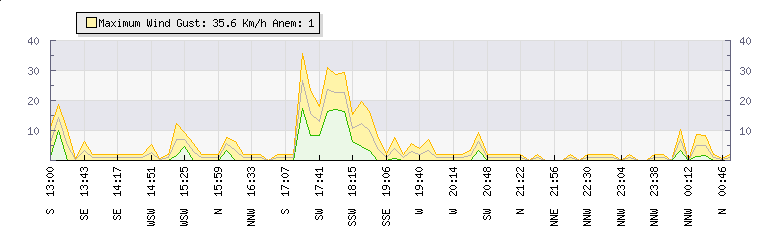 In the last few minutes the wind was North Westerly at an average speed of 0 kmh, reaching up to 0 kmh and a low of 0 kmh. The gust strength is0 kmh above the minimum speed |