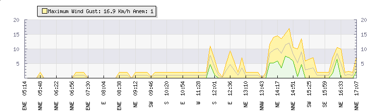 In the last few minutes the wind was East North East at an average speed of 1 kmh, reaching up to 2 kmh and a low of 0 kmh. The gust strength is2 kmh above the minimum speed |