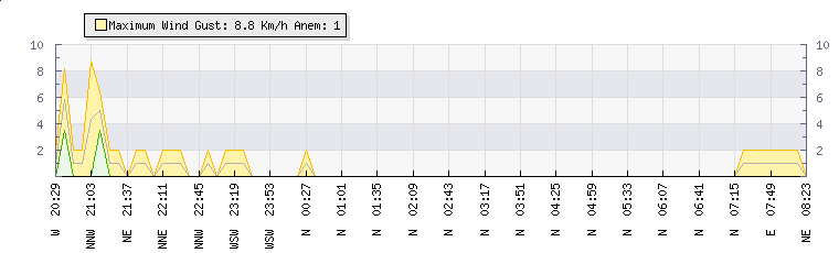 In the last few minutes the wind was Northerly at an average speed of 0 kmh, reaching up to 0 kmh and a low of 0 kmh. The gust strength is0 kmh above the minimum speed |