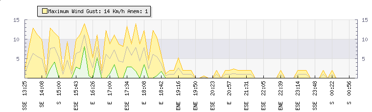 In the last few minutes the wind was South Easterly at an average speed of 1 kmh, reaching up to 2 kmh and a low of 0 kmh. The gust strength is2 kmh above the minimum speed |