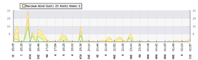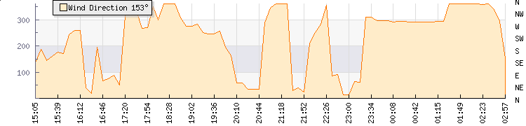 In the last few minutes the wind was West North West at an average speed of 0 knots, reaching up to 0 knots and a low of 0 knots. The gust strength is0 knots above the minimum speed |