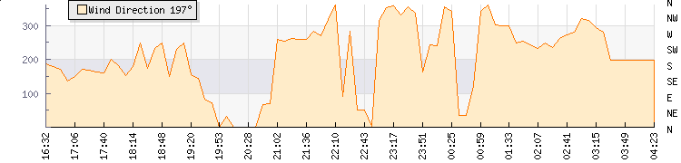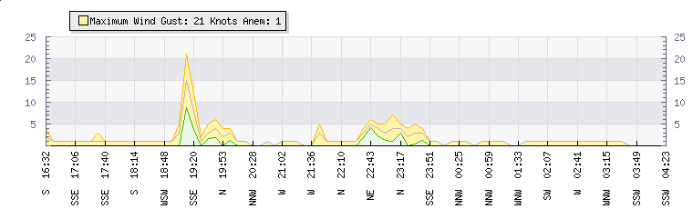 In the last few minutes the wind was Westerly at an average speed of 1 knots, reaching up to 1 knots and a low of 0 knots. The gust strength is1 knots above the minimum speed |