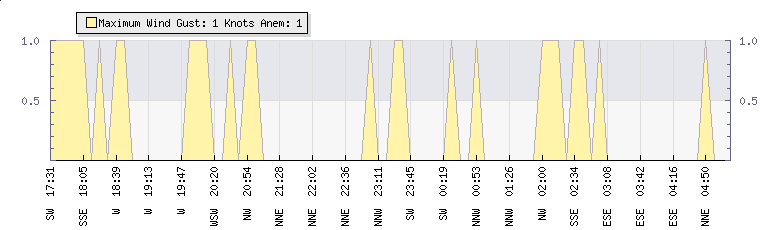 In the last few minutes the wind was East South East at an average speed of 0 knots, reaching up to 0 knots and a low of 0 knots. The gust strength is0 knots above the minimum speed |