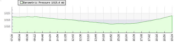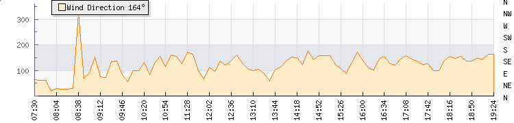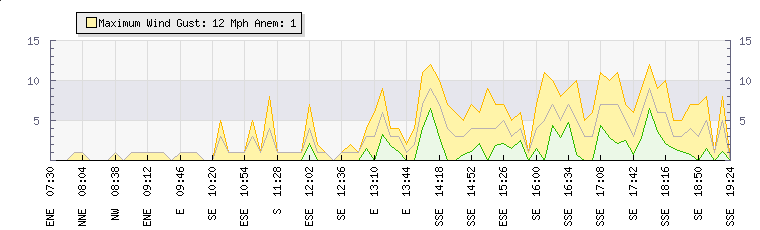 In the last few minutes the wind was South Easterly at an average speed of 4 mph, reaching up to 7 mph and a low of 1 mph. The gust strength is6 mph above the minimum speed |