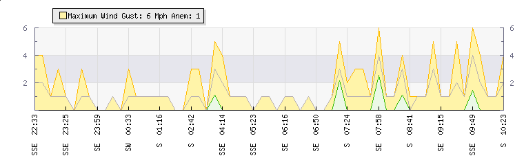 In the last few minutes the wind was Southerly at an average speed of 0 mph, reaching up to 0 mph and a low of 0 mph. The gust strength is0 mph above the minimum speed |