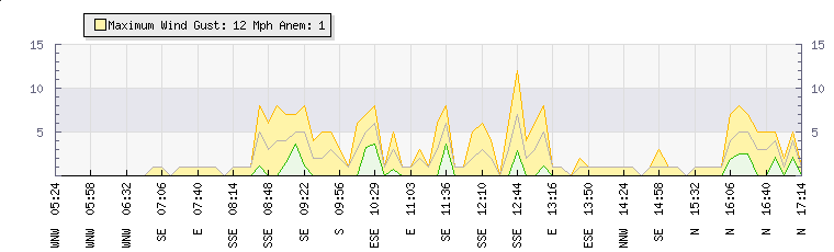 In the last few minutes the wind was East North East at an average speed of 0 mph, reaching up to 0 mph and a low of 0 mph. The gust strength is0 mph above the minimum speed |