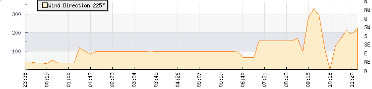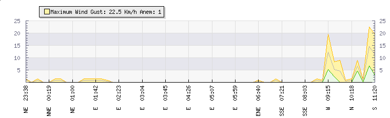 In the last few minutes the wind was North North West at an average speed of 5 kmh, reaching up to 8 kmh and a low of 2 kmh. The gust strength is6 kmh above the minimum speed |