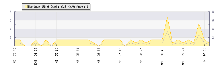 In the last few minutes the wind was Northerly at an average speed of 1 kmh, reaching up to 2 kmh and a low of 0 kmh. The gust strength is2 kmh above the minimum speed |
