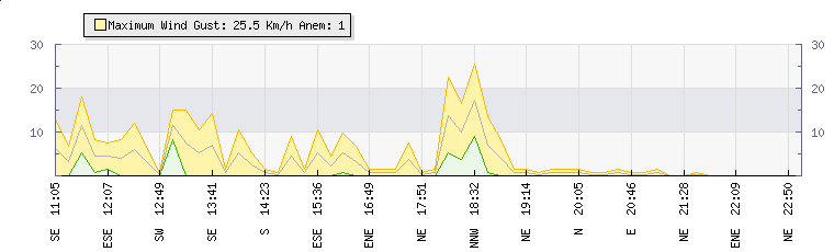 In the last few minutes the wind was East South East at an average speed of 3 kmh, reaching up to 7 kmh and a low of 0 kmh. The gust strength is7 kmh above the minimum speed |