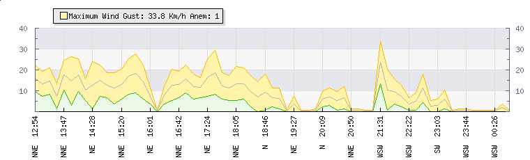 In the last few minutes the wind was North Easterly at an average speed of 5 kmh, reaching up to 11 kmh and a low of 0 kmh. The gust strength is11 kmh above the minimum speed |
