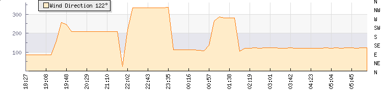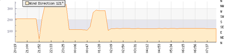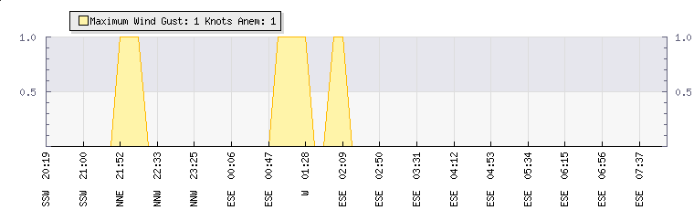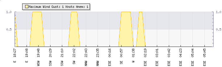 In the last few minutes the wind was East South East at an average speed of 0 knots, reaching up to 0 knots and a low of 0 knots. The gust strength is0 knots above the minimum speed |