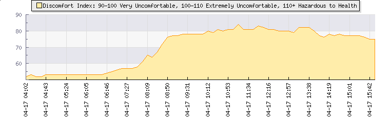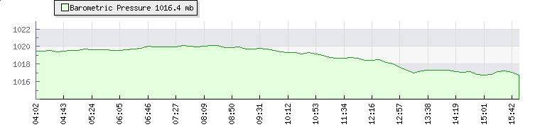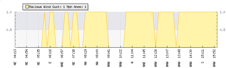 In the last few minutes the wind was Westerly at an average speed of 1 mph, reaching up to 1 mph and a low of 0 mph. The gust strength is1 mph above the minimum speed |