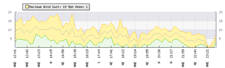 In the last few minutes the wind was North Westerly at an average speed of 10 mph, reaching up to 15 mph and a low of 5 mph. The gust strength is10 mph above the minimum speed |