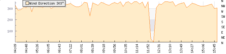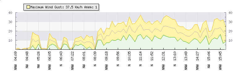 In the last few minutes the wind was North North West at an average speed of 19 kmh, reaching up to 27 kmh and a low of 11 kmh. The gust strength is16 kmh above the minimum speed |