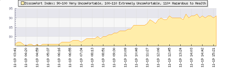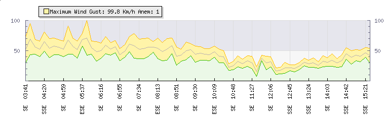 In the last few minutes the wind was South South East at an average speed of 26 kmh, reaching up to 32 kmh and a low of 21 kmh. The gust strength is11 kmh above the minimum speed |