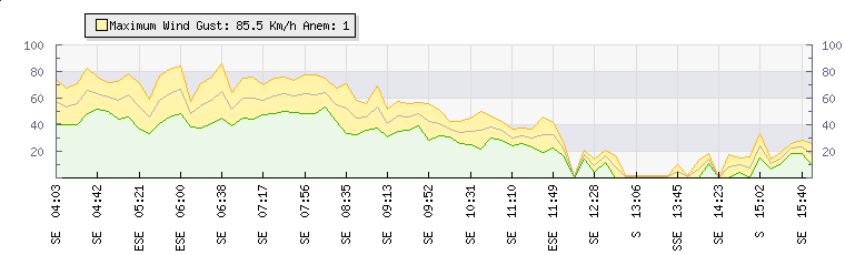 In the last few minutes the wind was East South East at an average speed of 8 kmh, reaching up to 17 kmh and a low of 0 kmh. The gust strength is17 kmh above the minimum speed |