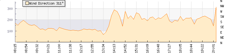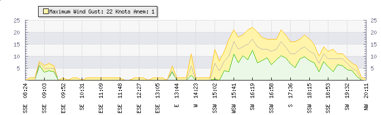 In the last few minutes the wind was South Easterly at an average speed of 1 knots, reaching up to 1 knots and a low of 0 knots. The gust strength is1 knots above the minimum speed |