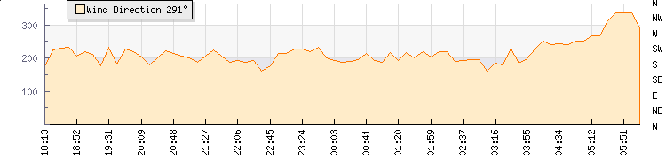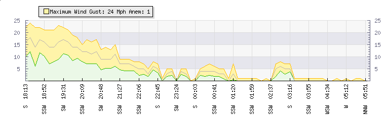 In the last few minutes the wind was South Westerly at an average speed of 7 mph, reaching up to 15 mph and a low of 0 mph. The gust strength is15 mph above the minimum speed |