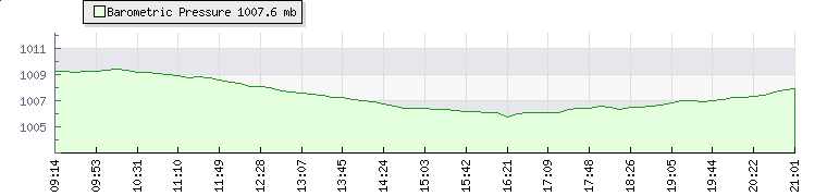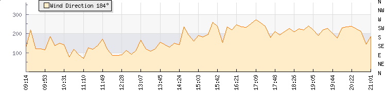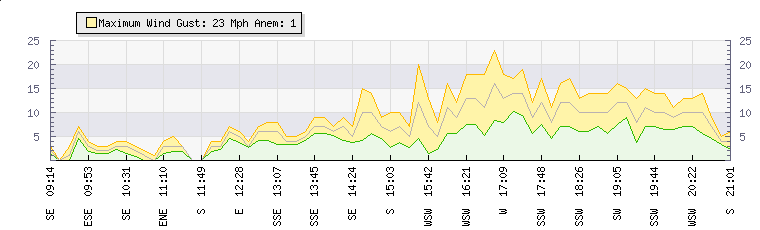 In the last few minutes the wind was Southerly at an average speed of 10 mph, reaching up to 14 mph and a low of 7 mph. The gust strength is7 mph above the minimum speed |
