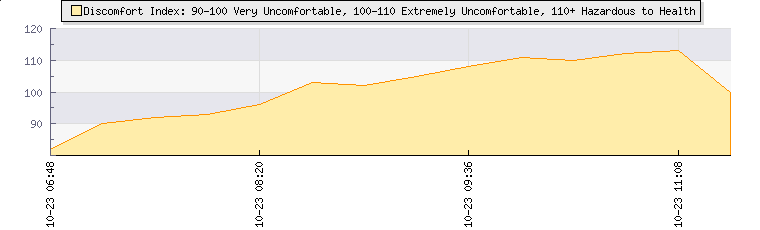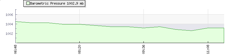 Wind Speed: | 0|0|0 kmh | Wind Direction: | NNW 344° | Temperature: | 26.5°C | Wet Bulb: | 20.2°C | Discomfort: | 92 | Humidity: | 56% | Rainfall Today: | 0mm | 12 hrs Rainfall: | 0mm | 24 hrs Rainfall: | 0mm | Barometer: | 1004mb | Dew Point: | 16.9°C | Clouds AGL: | 3800ft (1158 m) | Density-Alt: | 2215ft (675 m) | Fire Danger: | |