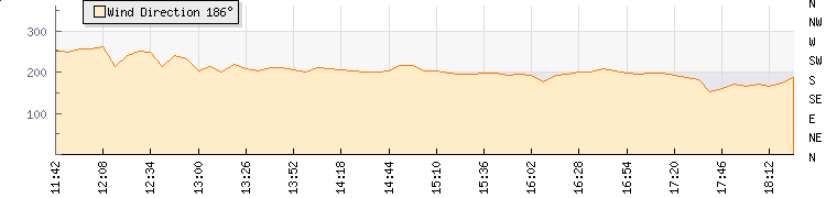In the last few minutes the wind was Southerly at an average speed of 7 kmh, reaching up to 11 kmh and a low of 4 kmh. The gust strength is7 kmh above the minimum speed |