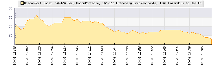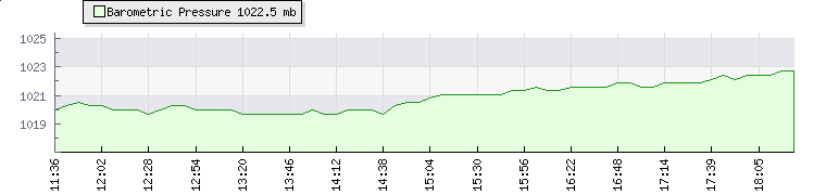 Wind Speed: | 4|7|11 kmh | Wind Direction: | S 186° | Temperature: | 14.1°C | Wet Bulb: | 11.6°C | Discomfort: | 63 | Humidity: | 77% | Rainfall Today: | 0mm | 12 hrs Rainfall: | 0mm | 24 hrs Rainfall: | 0mm | Barometer: | 1022.5mb | Dew Point: | 10.2°C | Clouds AGL: | 1590ft (485 m) | Density-Alt: | 79ft (24 m) | Fire Danger: | |