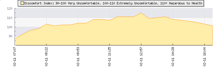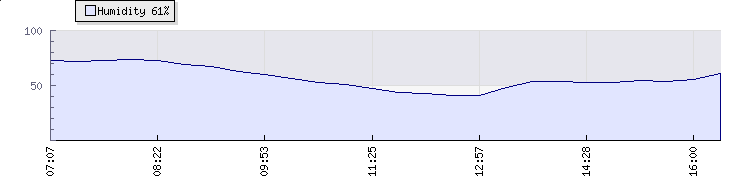 | Wind Speed: | 12|26|39 kmh | Wind Direction: | SSW 197° | Temperature: | 32.4°C | | Wet Bulb: | 25.1°C | Discomfort: | 106 | Humidity: | 54% | | Rainfall Today: | 0mm | 12 hrs Rainfall: | 0mm | 24 hrs Rainfall: | 0mm | | Barometer: | 1004.3mb | Dew Point: | 21.8°C | Clouds AGL: | 4209ft (1283 m) | | Density-Alt: | 2949ft (899 m) | Fire Danger: | |