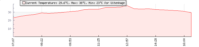 | Wind Gust: | 39 km/h | Min Temp: | 25 °C | Max Temp: | 38 °C | | Wind Average: | 26 km/h | Min Hum: | 41 % | Max Hum: | 74 % | |  |