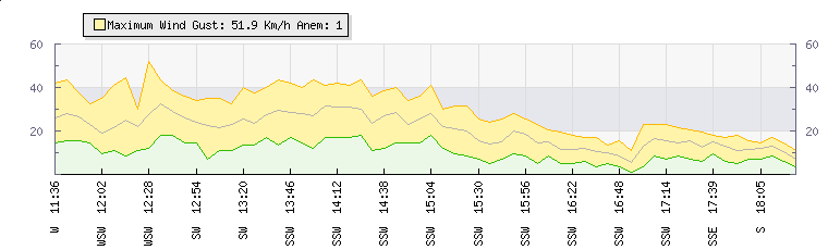 Wind Gust: | 52 km/h | Min Temp: | 14.1 °C | Max Temp: | 20.2 °C | Wind Average: | 35 km/h | Min Hum: | 52 % | Max Hum: | 77 % | |  |