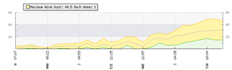 In the last few minutes the wind was South South West at an average speed of 26 kmh, reaching up to 39 kmh and a low of 12 kmh. The gust strength is27 kmh above the minimum speed |