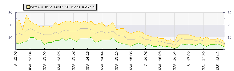 Wind Gust: | 28 knots | Min Temp: | 14.1 °C | Max Temp: | 20.2 °C | Wind Average: | 19 knots | Min Hum: | 52 % | Max Hum: | 77 % | |  |