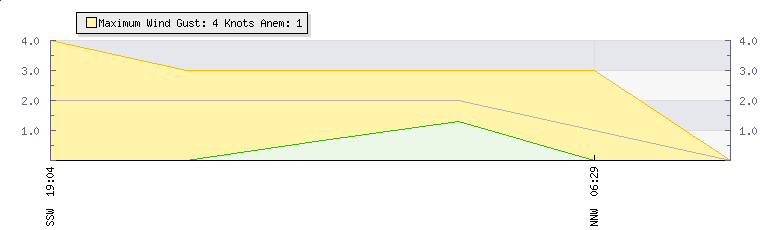 In the last few minutes the wind was South South West at an average speed of 1 knots, reaching up to 3 knots and a low of 0 knots. The gust strength is3 knots above the minimum speed |