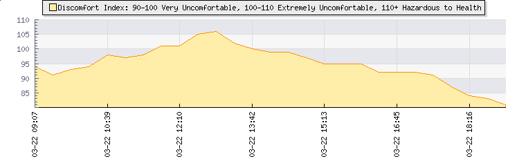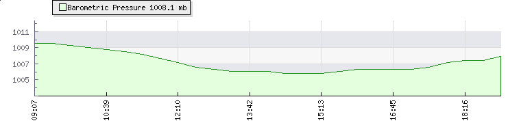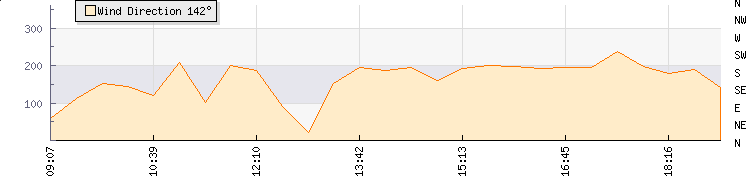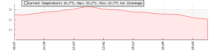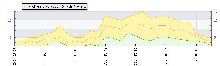 | Wind Gust: | 21 mph | Min Temp: | 17.9 °C | Max Temp: | 33.2 °C | | Wind Average: | 13 mph | Min Hum: | 46 % | Max Hum: | 77 % | |  |
