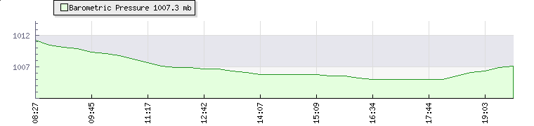 | Wind Speed: | 5|11|16 mph | Wind Direction: | WSW 238° | Temperature: | 24.5°C | | Wet Bulb: | 18.7°C | Discomfort: | 87 | Humidity: | 58% | | Rainfall Today: | 0mm | 12 hrs Rainfall: | 0mm | 24 hrs Rainfall: | 0mm | | Barometer: | 1006.2mb | Dew Point: | 15.6°C | Clouds AGL: | 3525ft (1074 m) | | Density-Alt: | 1896ft (578 m) | Fire Danger: | |