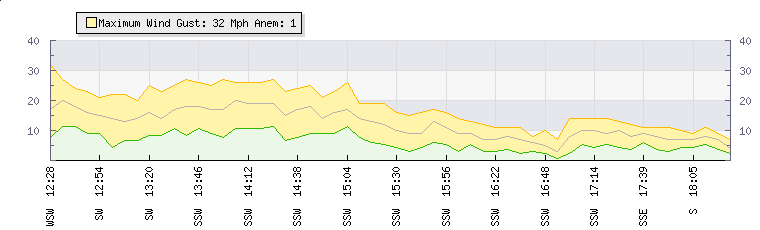 Wind Gust: | 32 mph | Min Temp: | 14.1 °C | Max Temp: | 20.2 °C | Wind Average: | 22 mph | Min Hum: | 52 % | Max Hum: | 77 % | |  |