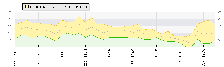 In the last few minutes the wind was West South West at an average speed of 11 mph, reaching up to 16 mph and a low of 5 mph. The gust strength is11 mph above the minimum speed |