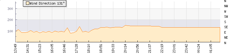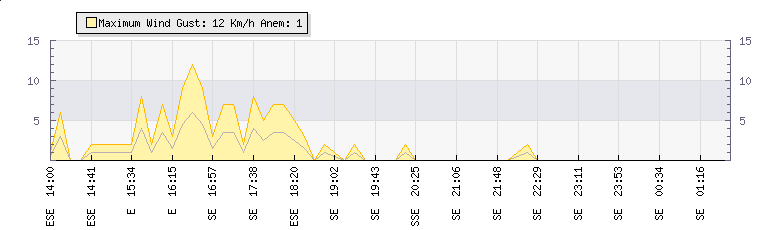 In the last few minutes the wind was South Easterly at an average speed of 0 kmh, reaching up to 0 kmh and a low of 0 kmh. The gust strength is0 kmh above the minimum speed |