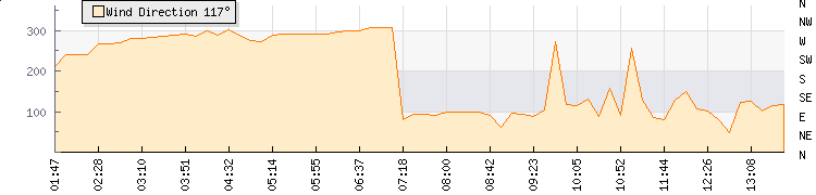 In the last few minutes the wind was South South East at an average speed of 4 kmh, reaching up to 7 kmh and a low of 0 kmh. The gust strength is7 kmh above the minimum speed |